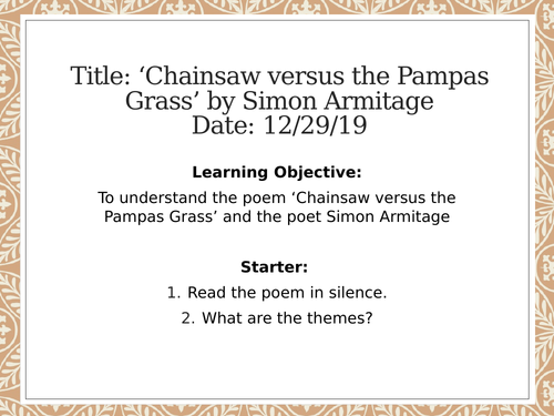 Poem Analysis Chainsaw Versus The Pampas Grass By Simon Armitage Teaching Resources